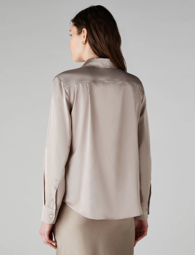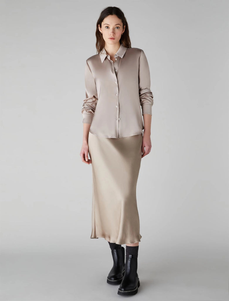 Al tempo stesso classica e sensuale: la camicia in raso stretch infonde un'aura di eleganza a ogni outfit. La texture soft e luminosa è il nuovo passe-partout della stagione.