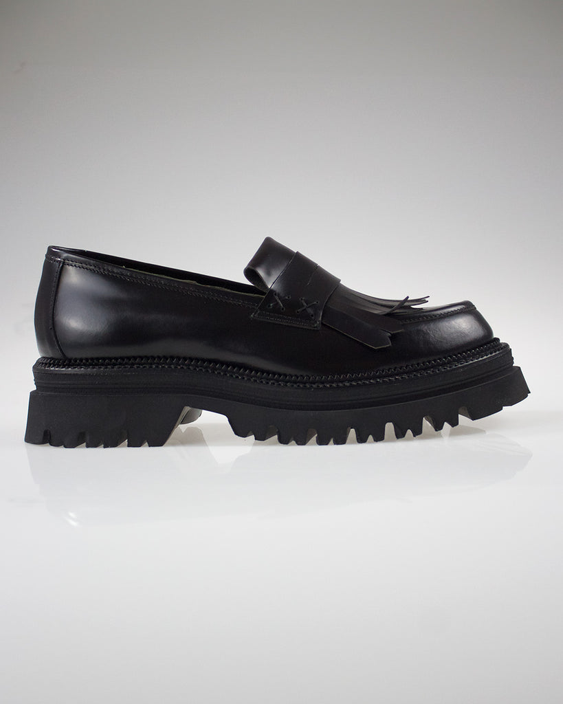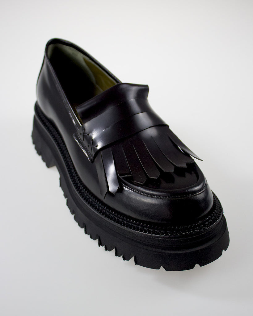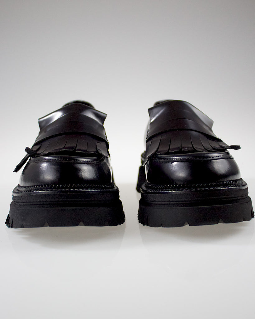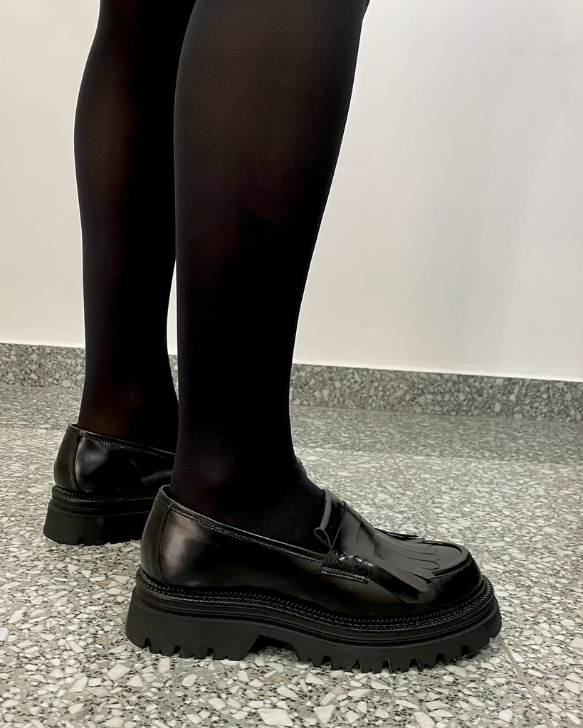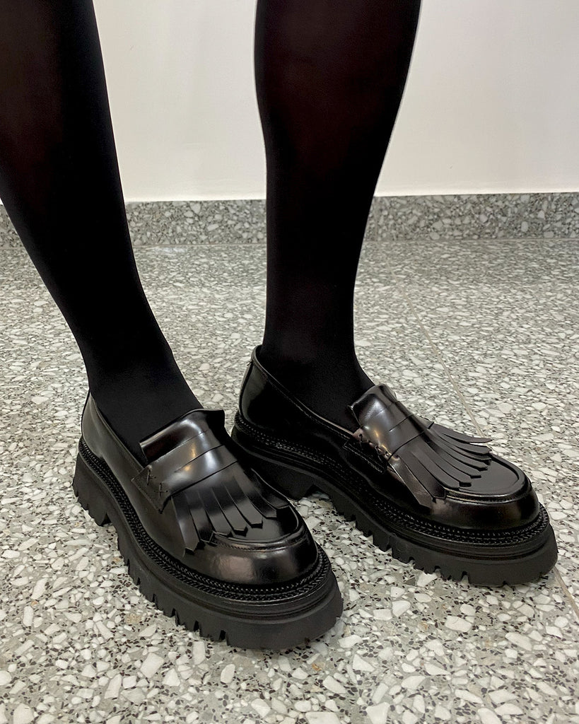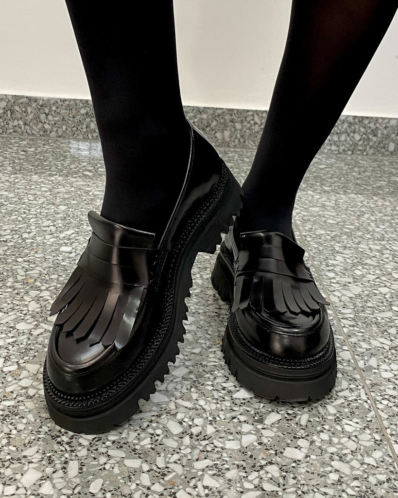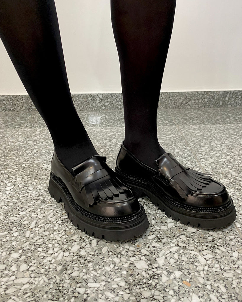 Un must-have per chi ama uno stile raffinato ed elegante, il Mocassino Nero con Frange e Pelle Lucida combina design classico e dettagli moderni. La pelle nera lucida, lavorata artigianalmente, dona una brillantezza sofisticata al modello, mentre le frange decorano con gusto la parte superiore, aggiungendo movimento e originalità. Ideale per look versatili, si adatta perfettamente sia ad outfit formali che casual chic.