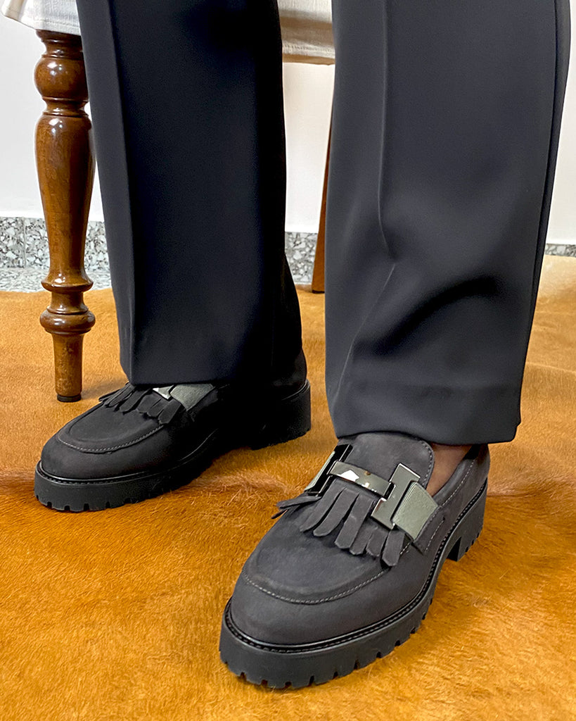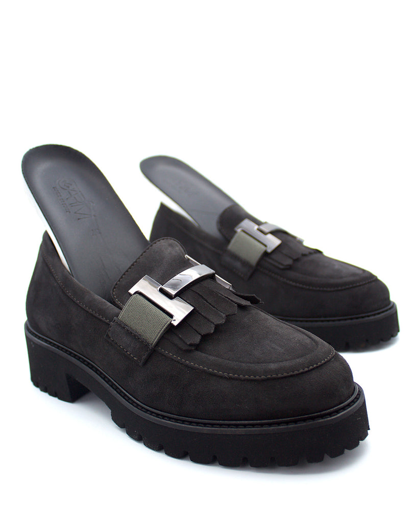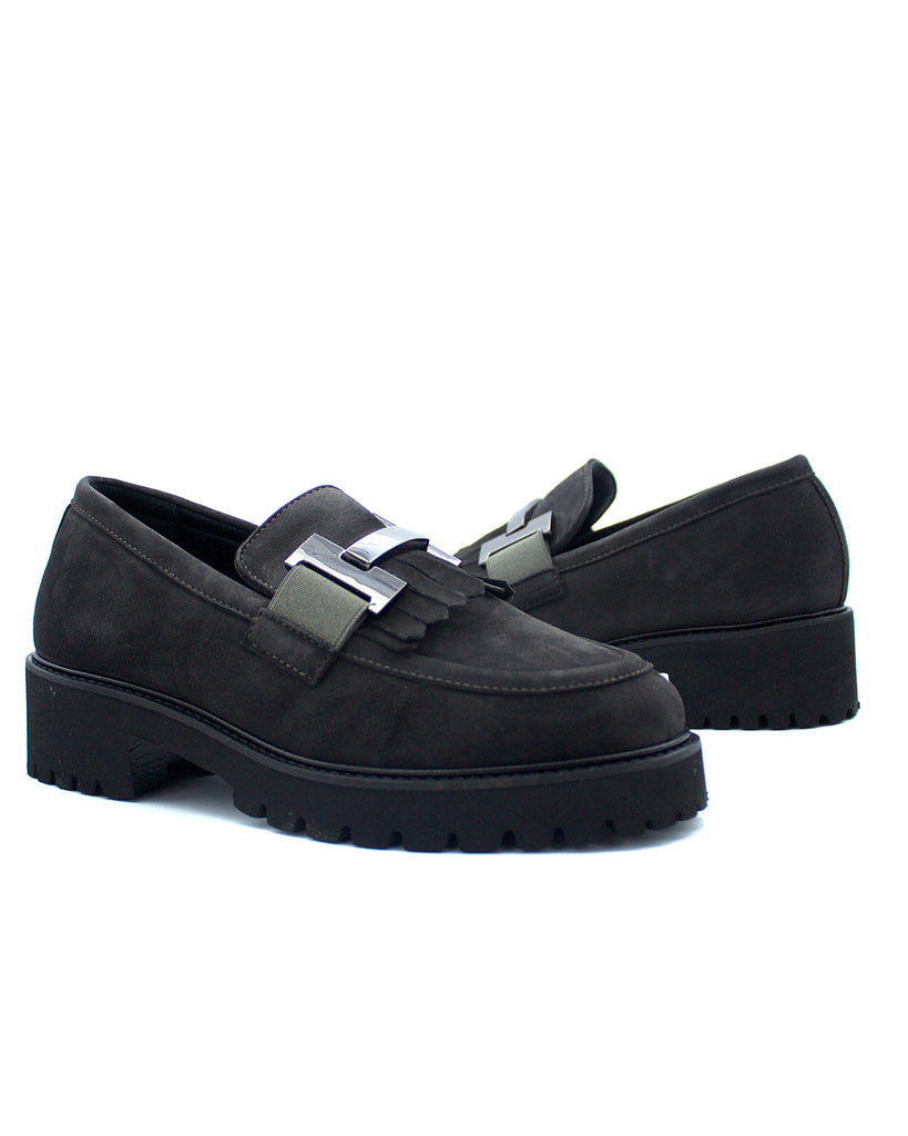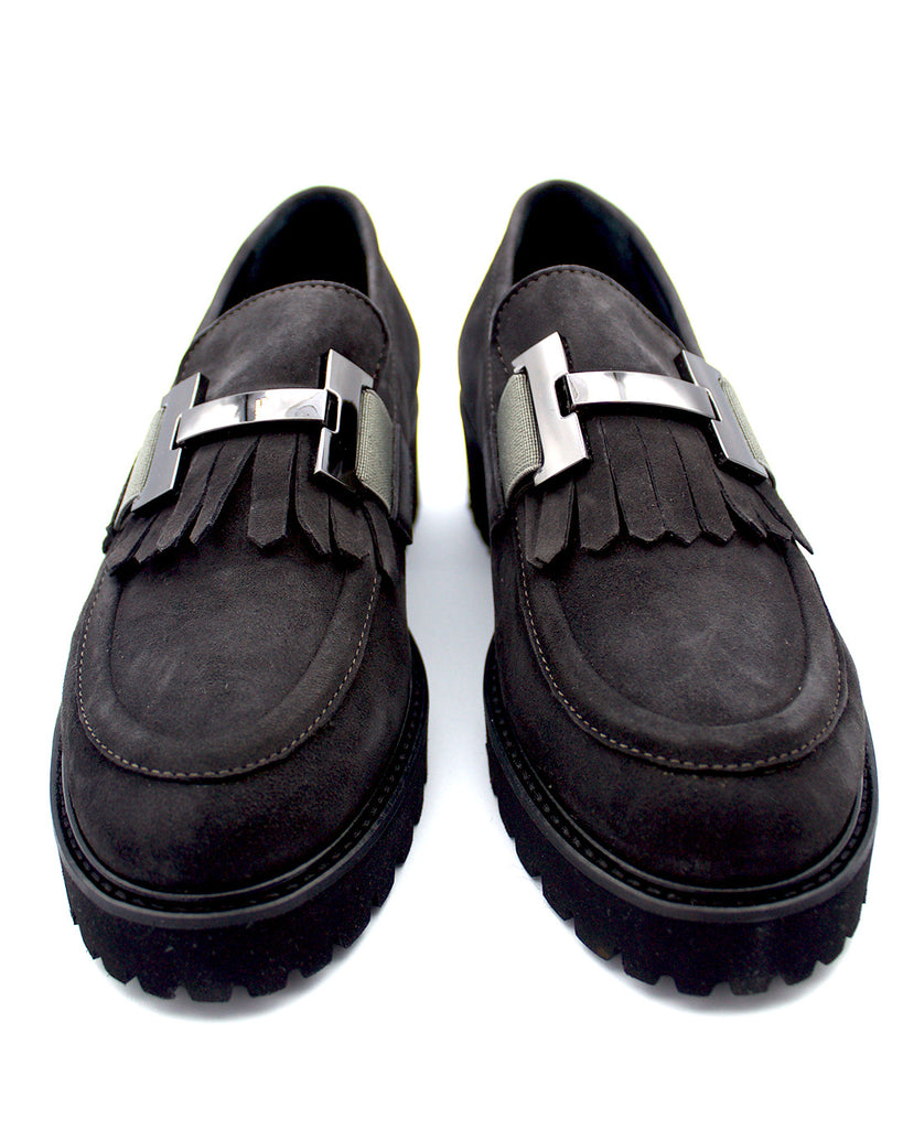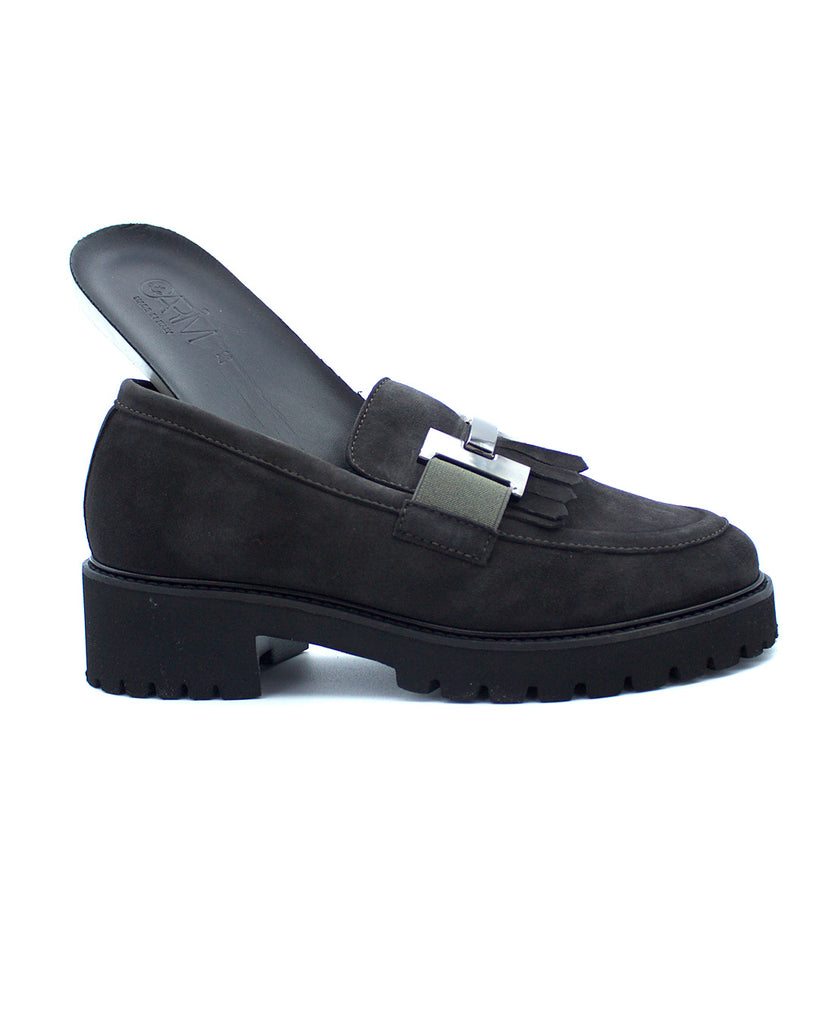 Il mocassino Carim, con un elegante design arricchito da una pattina, frangia e un accessorio decorativo, rappresenta l’unione perfetta tra eleganza e praticità. Disponibile nei raffinati colori antracite e testa di moro è impreziosito da un accessorio per una maggiore lucentezza. Il mocassino è completato da un elasticoche garantisce una calzata più facile e confortevole. Con un fondo leggero e un tacco di 3 cm, perfetto per occasioni casual ma anche più formali.