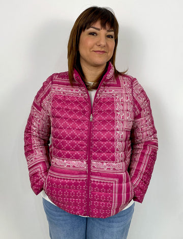 Un connubio interessante di materiali e fantasie. Il piumino imbottito dal taglio leggermente svasato e reversibile è proposto nella stampa foulard di collezione.