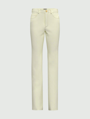 Pantaloni ricchi di dettagli del mondo denim come le cinque tasche e il bottone in metallo personalizzato. Il capo è caratterizzato da una linea slim flare.