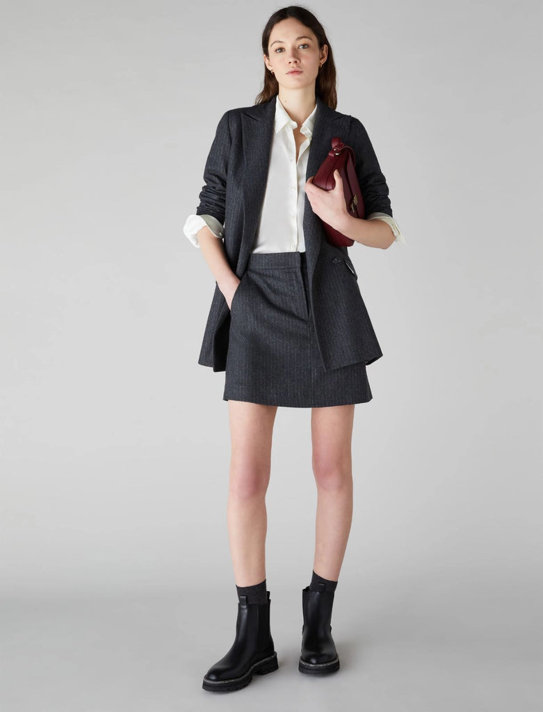 Tradizione sartoriale aggiornata per i look urban chic. Il blazer in flanella stretch esalta morbidamente la figura con i rever a lancia e la chiusura monopetto bassa. Imperdibile anche la minigonna coordinata.