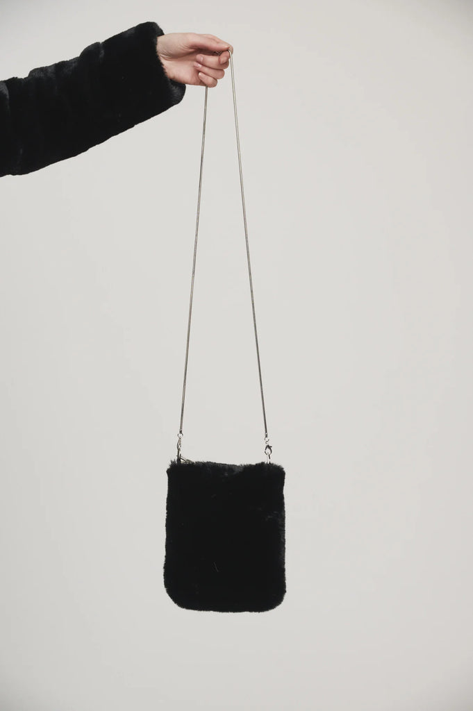 Piccola borsa a tracolla con lungo manico in metallo. Staccare il sottile cordone metallico con i suoi fermagli. Questo eyecatcher presenta una chiusura con cerniera con profili a contrasto e un tessuto superiore in pelliccia sintetica.